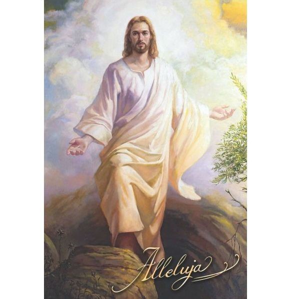Plakat z wizerunkiem Jezusa Zmartwychwstałego.