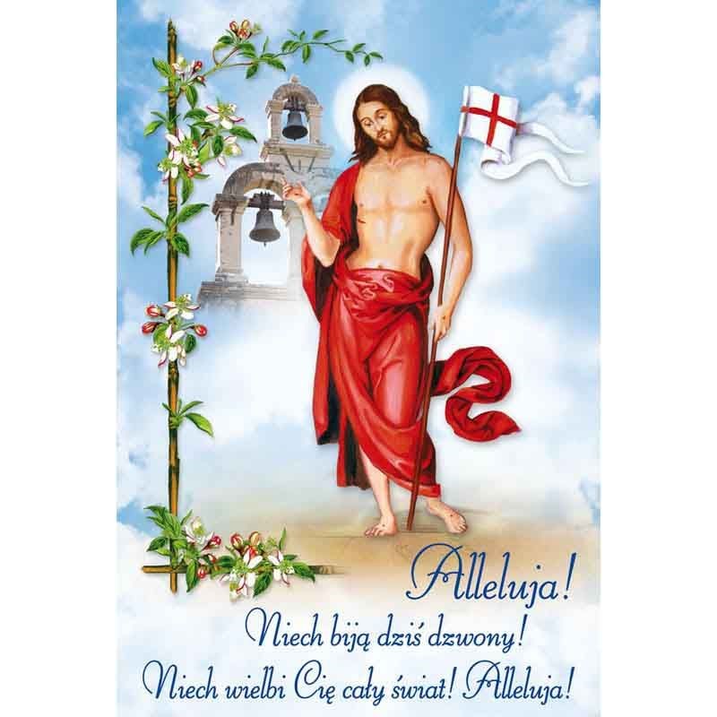 Plakat z wizerunkiem Jezusa Zmartwychwstałego.