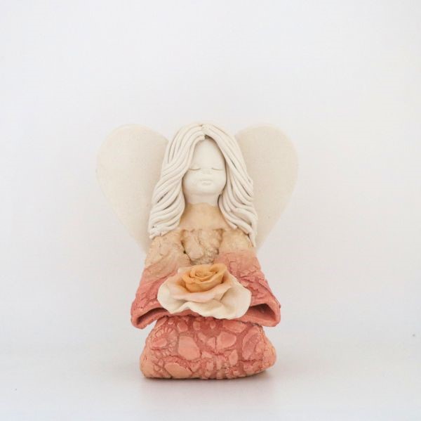 Figura przedstawiająca Anioła Stróża - klęcząca Dziewczynkę z kwiatkiem w dłoniach. Produkt ceramiczny, ręcznie malowany.