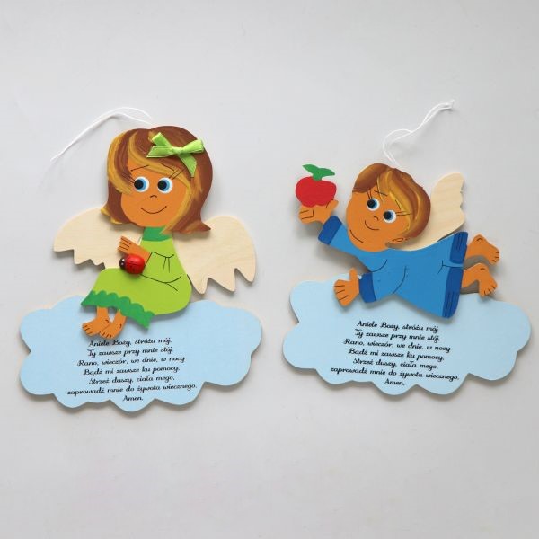 Zawieszka z wizerunkiem Anioła Stróża oraz tekstem modlitwy.