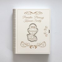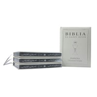 Atrakcyjna szata graficzna, oprawa skóropodobna ze złoceniem na gorąco, złota/srebrna wstążka oraz złoty/srebrny rant z nadrukiem pierwszokomunijnym, podkreślają niezwykłą dbałość o estetykę pamiątkowego wydania Biblii dla dzieci.