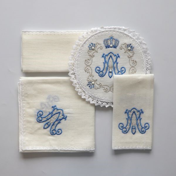 - Palka. Zdobiona haftowanym - symbolem maryjnym. Obszyta delikatną koronką, 100% len.