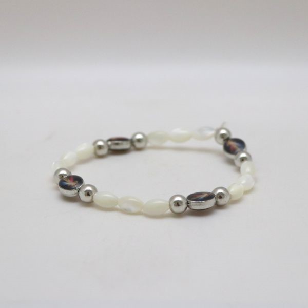 Bransoletka na ręke wykonana z paciorków z tworzywa sztucznego, metalowych elementów oraz gumki.