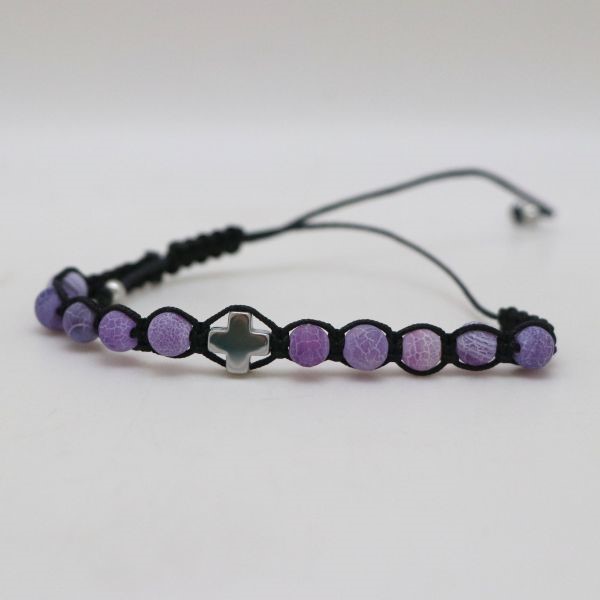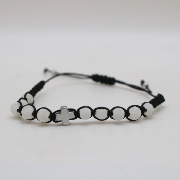 Bransoletka na ręke wykonana z paciorków z tworzywa sztucznego oraz sznurka.