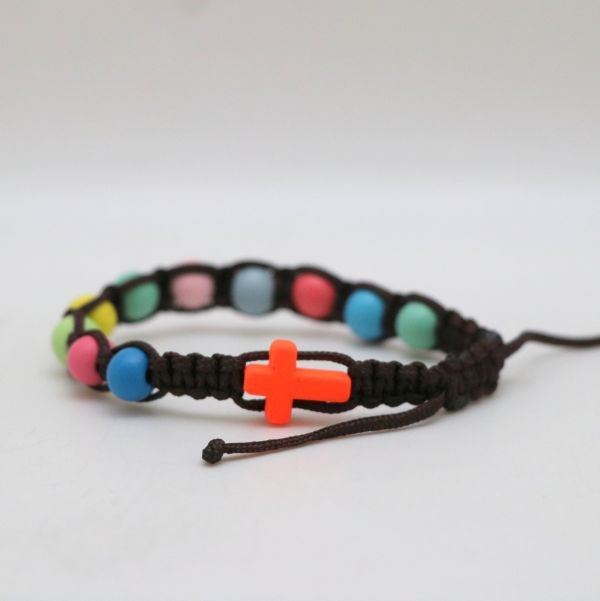 Bransoletka na ręke wykonana z paciorków z tworzywa sztucznego oraz sznurka.