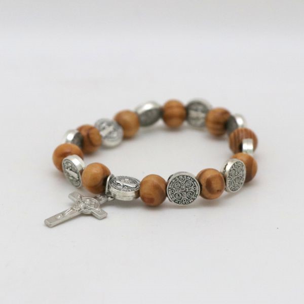 Bransoletka na ręke wykonana z drewnianych i metalowych elementów oraz elastycznej gumki.