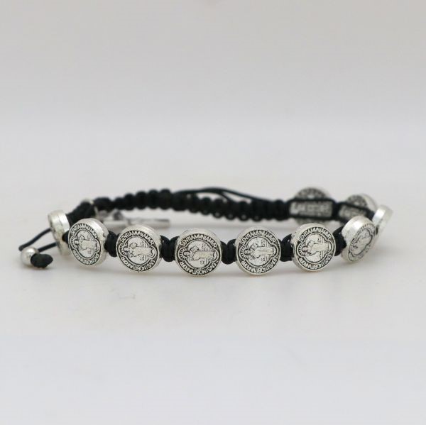 Bransoletka wykonana z metalowych elementów oraz sznurka.
