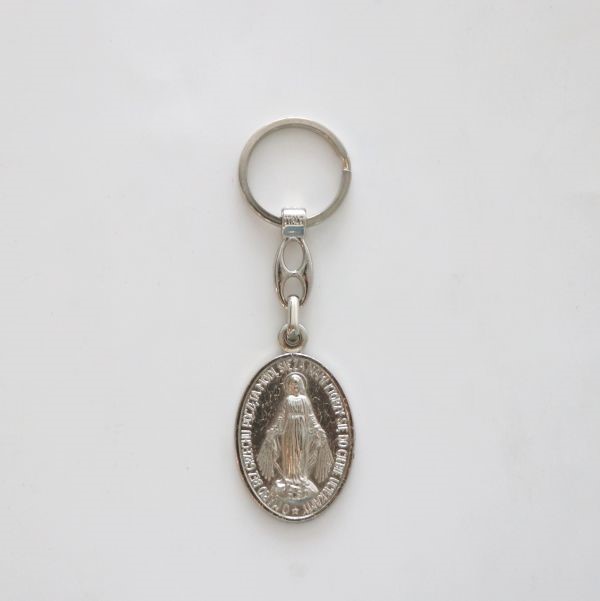 Brelok metalowy z wizerunkiem Matki Bożej Niepokalanej.