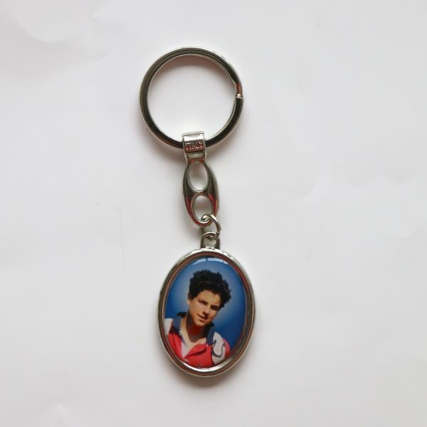 Brelok metalowy z wklejką przedstawiającą Carla Acutisa (awers) oraz Św. Krzysztofa (rewers).