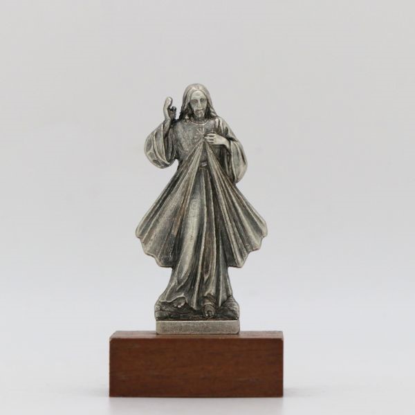 Figurka metalowa przedstawiająca Jezusa Miłosiernego. Figurka zamontowana na drewnianej podstawce.