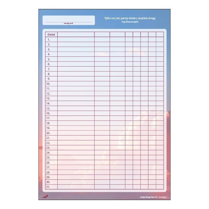 Szukasz uniwersalnego plannera, w którym zanotujesz swoje plany, postanowienia i zadania? Skorzystaj z uniwersalnego kalendarza ściennego – bez roku, miesięcy, weekendów i świąt. To praktyczny pomocnik do wykorzystania w dowolnym czasie.