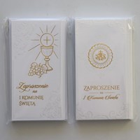 W środku koperty widnieje zaproszenie na uroczystość przyjęcia Komunii Św.