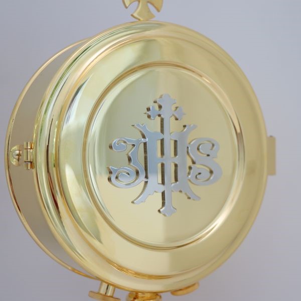 Kustodia na dużą hostię z regulowaną prowadnicą. Wykonana z mosiądzu, złocona, zdobiona rubinami. Na drzwiczkach kustodii IHS grawerowany, srebrzony (dostępność wariantu IHS zależna jest od dostawy).