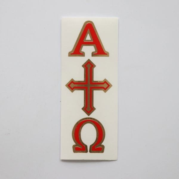 Naklejka posiada nadruk przedstawiający greckie litery Alfa i Omega- oznaczające, że do Chrystusa należy czas i wieczność. Produkt wysokiej jakości, pięknie ozdobiony termo-drukiem w kolorze złotym. Zabezpieczony lakierem UV.