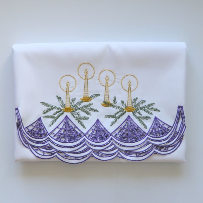 Gotowy obrus z ozdobnym haftem adwentowym.