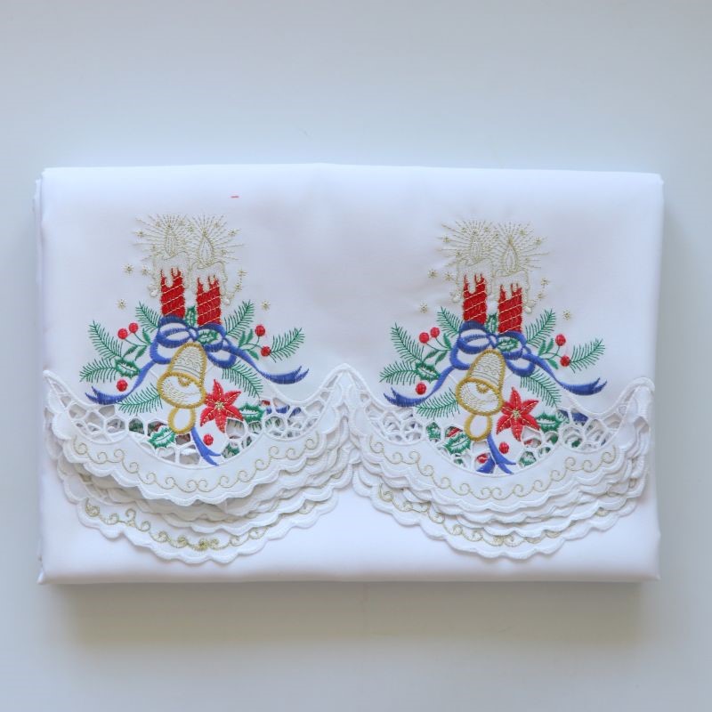 Gotowy obrus z ozdobnym haftem bożonarodzeniowym.