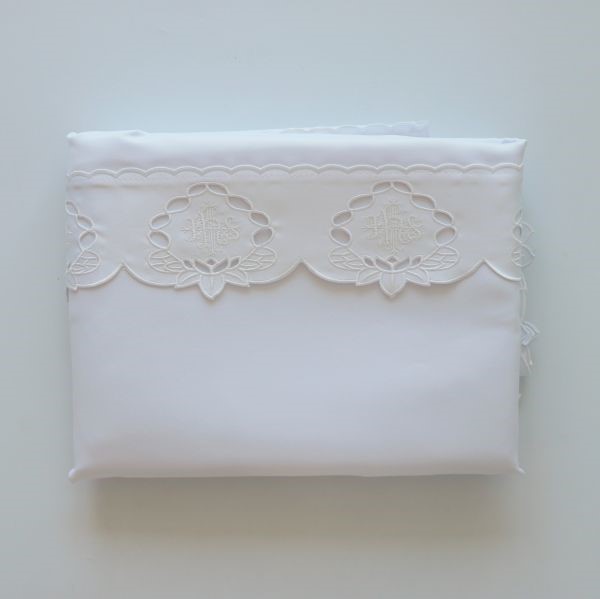 Gotowy obrus ołtarzowy o wymiarach 3.00 x 1.30 cm z motywem eucharystycznym.