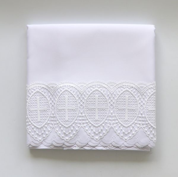 Gotowy obrus z dekoracyjną gipiurą podszytą tkaniną.