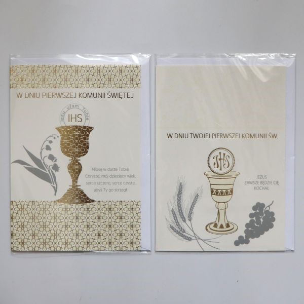 Karnet komunijny w formacie B6 ze złoceniami. Cena dotyczy 1 sztuki. Zdjęcie przestawia przykładowe wzory kartek.