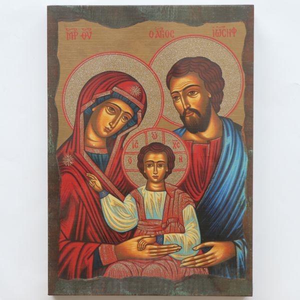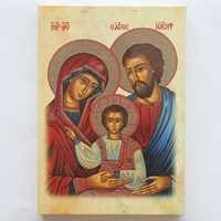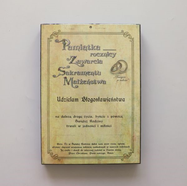 Obraz z wizerunkiem Świętej Rodziny a na odwrocie tekst błogosławieństwa z okazji rocznicy zawarcia małżeństwa.