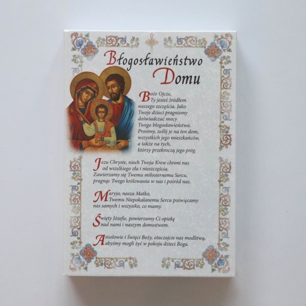 Obrazek - plakietka z wizerunkiem Świętej Rodziny, wykonany z twardej tektury. Na obrazku oraz jego odwrocie widnieje tekst błogosławieństwa domu.