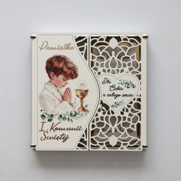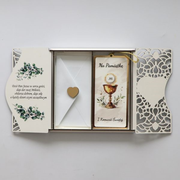 W środku znajduje się koperta z laukrą oraz zawieszka drewniana.
