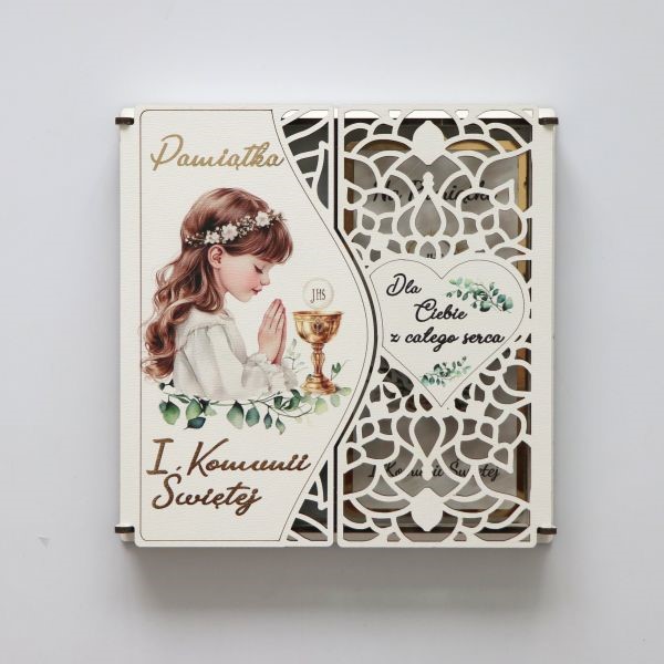 W środku znajduje się koperta z laukrą oraz zawieszka drewniana.