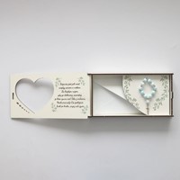 W środku znajduje się koperta z laukrą oraz mały różaniec.