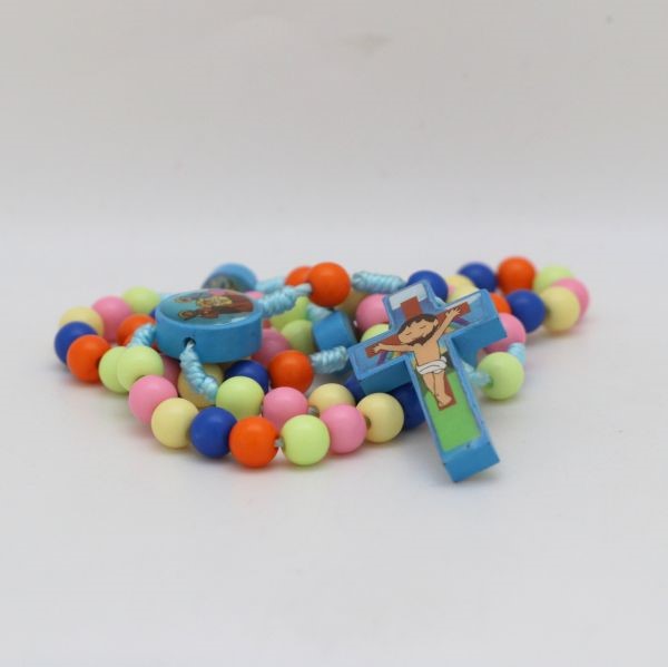 Różaniec wykonany z paciorków z tworzywa sztucznego oraz sznurka.