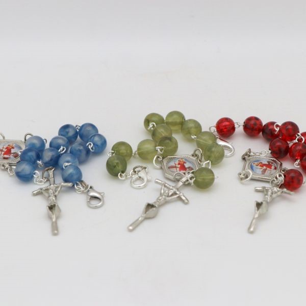 Dziesiątka różańca wykonana z tworzywa sztucznego w różnych kolorach, z łącznikiem zawierającym wizerunek Św. Krzysztofa.