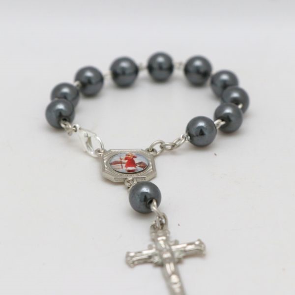 Dziesiątka różańca wykonana z hematytowych koralików oraz metalowych elementów.