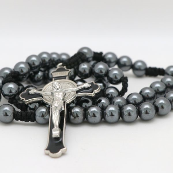 Różaniec wykonany z hematytowych koralików (8mm) oraz metalowych elementów.