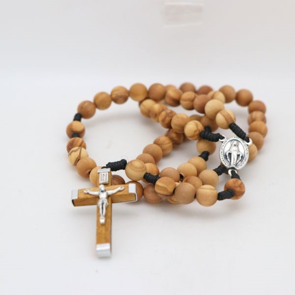 Różaniec wykonany z paciorków z drzewa oliwnego, sznurka oraz metalowych elementów.
