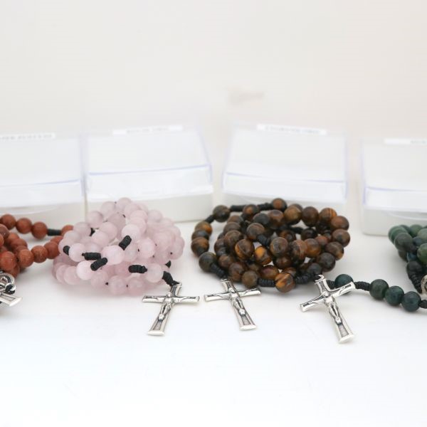 Każdy różaniec zapakowany jest w pudełko.