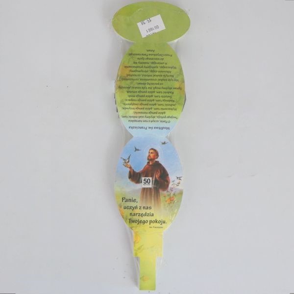 Stojaczek papierowy do samodzielnego złożenia z wizerunkiem Św. Franciszka i modlitwą.