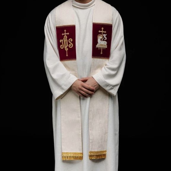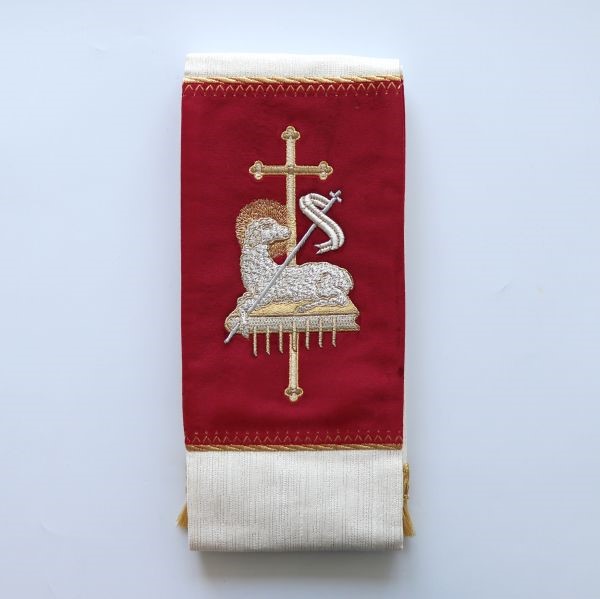 Ta jednostronna stuła została wykonana z wysokiej jakości gładkiej tkaniny i bogato zdobiona haftem przedstawiającym symbol Baranka Bożego.
