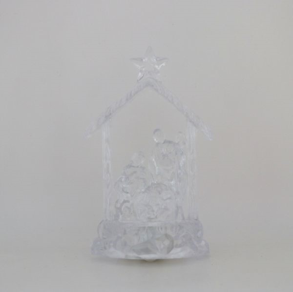Figurka z tworzywa sztucznego przedstawiająca Świętą Rodzinę, podświetlana zmieniającą kolor lampką.