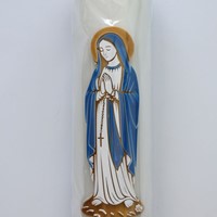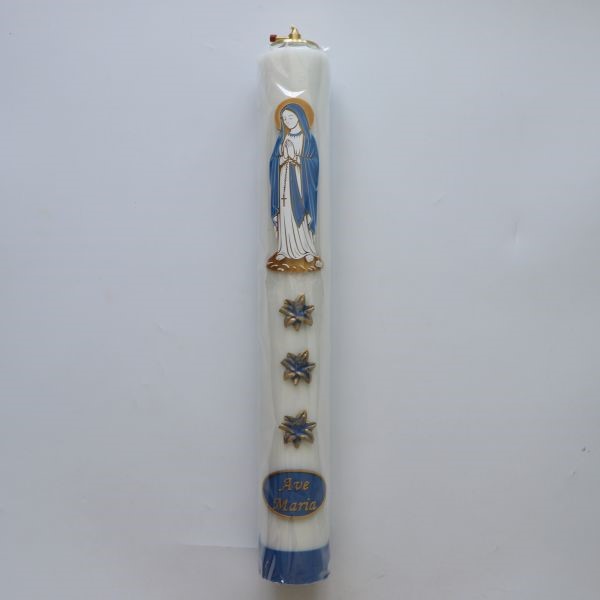 Świeca roratnia olejowa wykonana z parafiny, ozdobiona aplikacjami z tworzywa sztucznego. Na zdjęciu widoczny jest przykładowy wzór aplikacji.