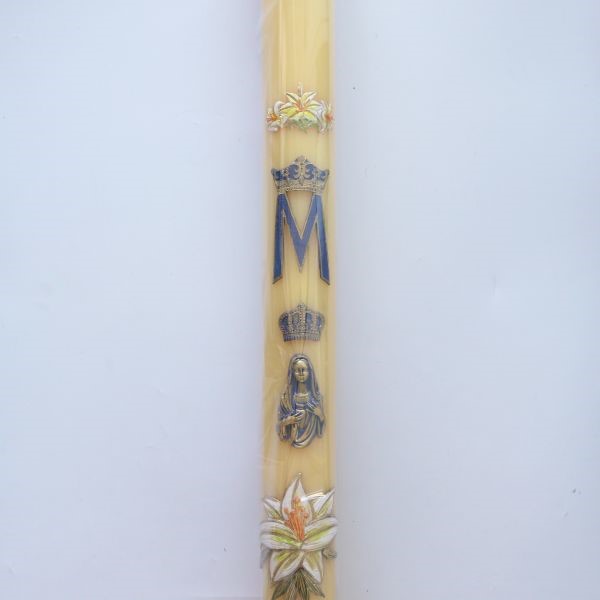Świeca roratnia olejowa o wysokości 90 cm oraz 9 cm średnicy, wykonana z parafiny, ozdobiona aplikacjami z parafiny, ręcznie zdobiona i malowana. Na zdjęciu widoczny jest przykładowy wzór aplikacji.