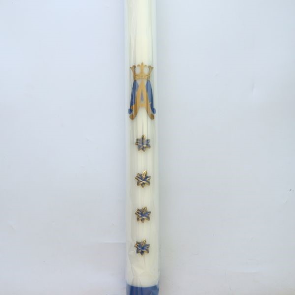 Świeca roratnia spalająca (na knot) o wysokości 100 cm oraz 8 cm średnicy, wykonana z parafiny, ozdobiona aplikacjami.