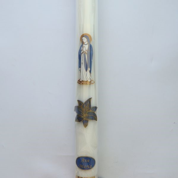 Świeca roratnia spalająca (na knot) o wysokości 100 cm oraz 9 cm średnicy, wykonana z parafiny, ozdobiona aplikacjami.