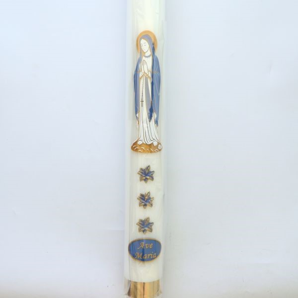 Świeca roratnia spalająca (na knot) o wysokości 100 cm oraz 9 cm średnicy, wykonana z parafiny, ozdobiona aplikacjami.