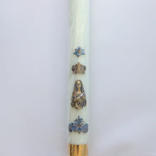 Świeca roratnia spalająca (na knot) o wysokości 80 cm oraz 8 cm średnicy, wykonana z parafiny, ozdobiona aplikacjami z parafiny, ręcznie zdobiona i malowana.