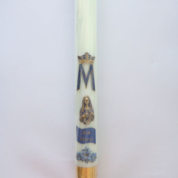 Świeca roratnia spalająca (na knot) o wysokości 90 cm oraz 9 cm średnicy, wykonana z parafiny, ozdobiona aplikacjami z parafiny, ręcznie zdobiona i malowana. Na zdjęciu widoczny jest przykładowy wzór aplikacji.