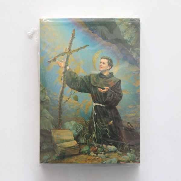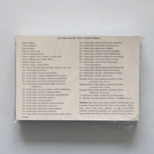 Kartki w formacie pocztówkowym z wizerunkiem Św. Franciszka oraz treścią litani do świętego.