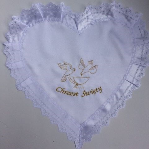 Szatka do chrztu w kształcie serca z ozdobnym haftem. Koronka wokół szatki może się różnić w zależności od dostawy.