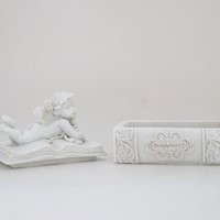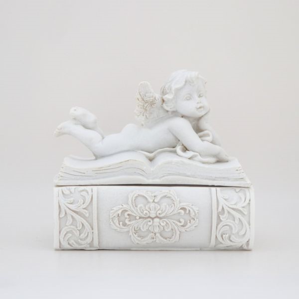 Szkatułka z pokrywką na której widnieje figurka Aniołka.