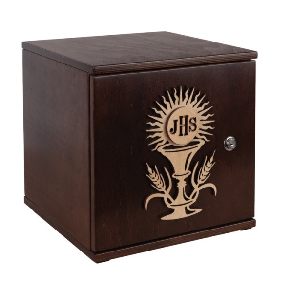 Szlachetne wykończenie: Głęboki kolor uzyskany dzięki wysokiej jakości bejcy nadaje tabernakulum powagi i elegancji, typowej dla tradycyjnych elementów wyposażenia wnętrz sakralnych.