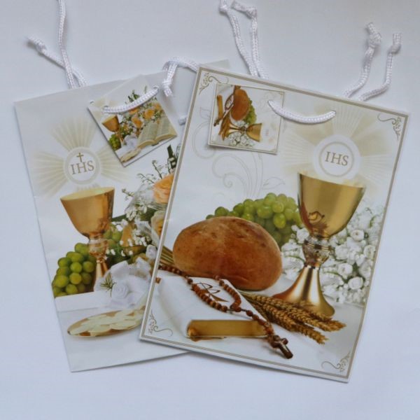 Torba foliowana prezentowa z motywem komunijnym. Cena dotyczy 1 sztuki. Zdjęcie przedstawia przykładowe wzory toreb.
