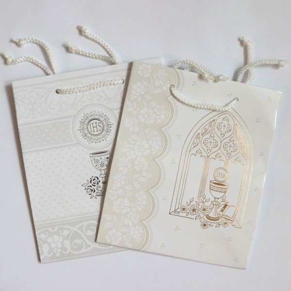 Torba foliowana prezentowa formatu T4 z motywem komunijnym. Cena dotyczy 1 sztuki. Zdjęcie przedstawia przykładowe wzory toreb.